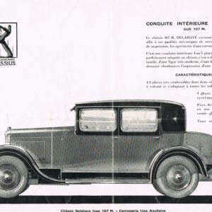 De nombreuses carrosseries sont proposées, torpédo quatre places, conduite intérieure semi tôlée, conduite intérieure “berline souple”, faux cabriolet semi-tôlé, faux cabriolet souple, cabriolet quatre places, conduite intérieure “berline quatre places Aquitaine” carrossée par Manessius ainsi que la limousine six glaces “Champagne” avec strapontin en option. Plusieurs options également sont proposées: schémas de peinture deux tons sur Aquitaine, pare-chocs double, malle arrière, deux mallettes intérieures. La large production implique un nouveau rapport avec des carrossiers qui ont ou doivent acquérir une dimension industrielle encore rare avec le revêtement tout acier (et donc les outillages et presses adaptées) sur des structures bois, ce qui entraîne le resserrement des relations entre Delahaye et SPCA qui est le carrossier privilégié de Chenard (berlines,limousines, faux cabriolet, cabriolet) et surtout le carrossier Currus qui réalise des conduite intérieure “berline souple” ou “semi-tôlée” ainsi que des coach et des berlines avec finition luxe (pare-choc, pare-pierre, roues flasquées)